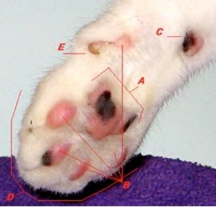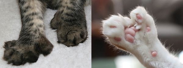 2) Dewclaw: This is an underdeveloped digit that doesn't touch the ground. On a non-poly cat you can find this claw on the inner side of the paw. With a poly paw you may also have a (extra) dewclaw between two other digits or the dewclaw may even be absent.