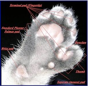Separate (‘mouse’) pad: Comparable to the fleshy part of our hand in connection with our thumb, this pad is associated with the thumb on a paw and is not attached to plantar/palmar pads. This pad is also further up on the foot than the standard plantar/palmar pad. Note: Thumbs on the back paws will also have a separate pad.